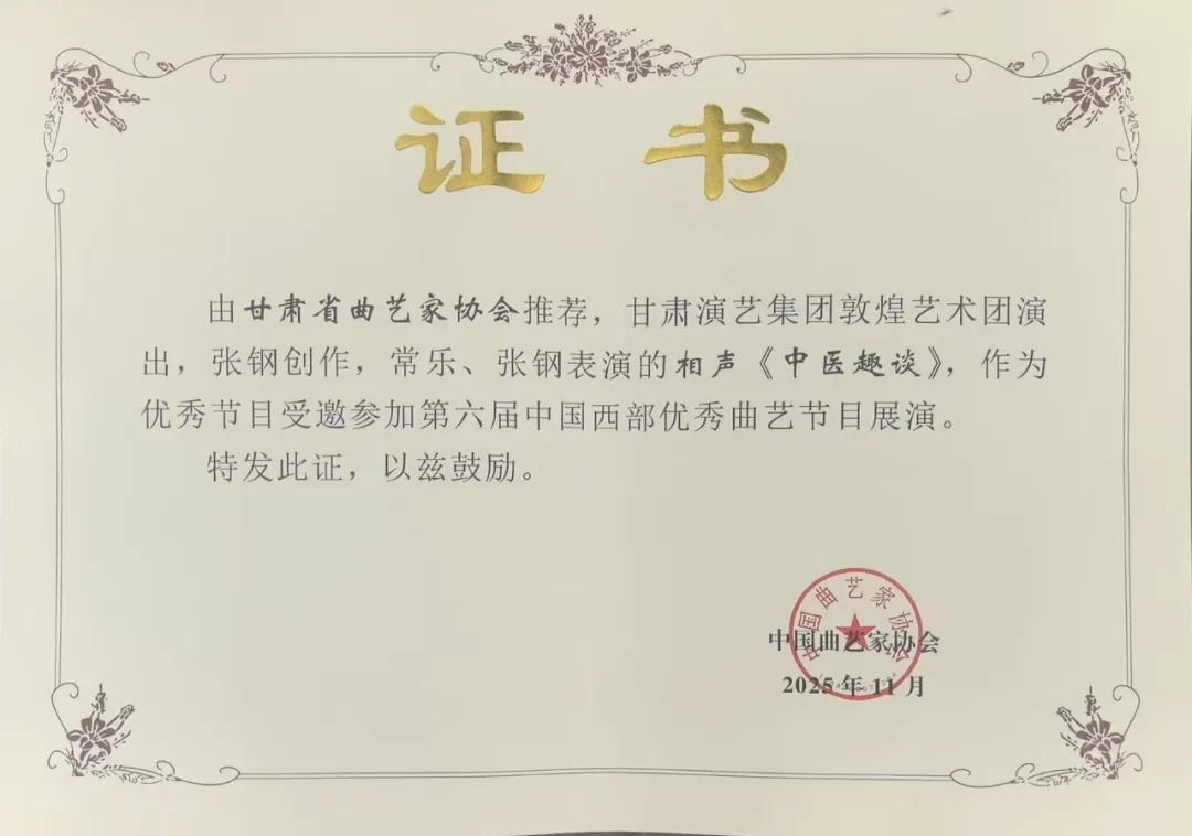 曲开巴山,艺向未来。11月11至14日,由中国曲协、四川省文联联合主办的第六届中国西部优秀曲艺节目展演活动在四川巴中成功举办。甘肃曲艺节目河州小调《大眼睛》和相声《中医趣谈》成功入选并精彩亮相此次西部曲艺盛会,展现陇原曲艺的独特魅力与时代风采。